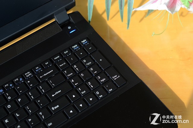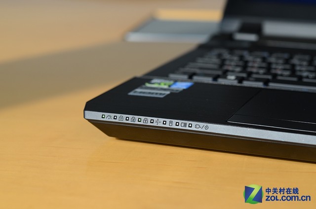 触摸板方面,战神Z7采用分离式设计,左右按键与触控区域分离,而表面则是与机身外壳复合材料相同,滑动流畅,汗手用户也能够较为流畅的触摸操作。掌托位置,表面采用与顶盖相同设计的金属拉丝,防滑能力较强。键盘面除了右上角具备蓝色灯光的电源按钮以外没有其他功能按键,掌托左前位置一排密集的功能指示灯。