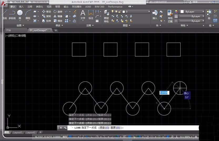 6、下边的圆也一样,中间的圆关闭正交模式,后连接,确定中心画圆就好。
