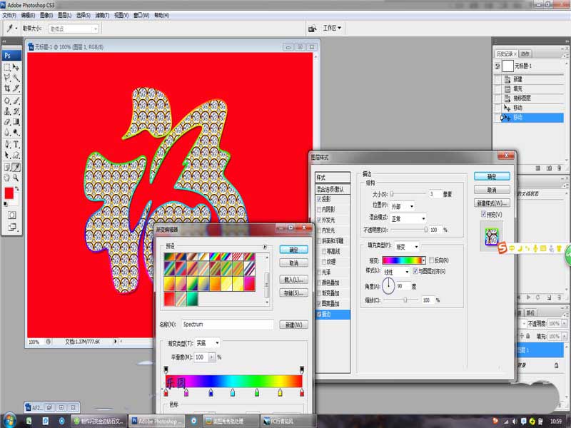 6、双击文字图层,并在弹出的图层样式对话框中选择“描边”命令,填充类型为渐变,颜色设置为彩虹色,如下图所示。