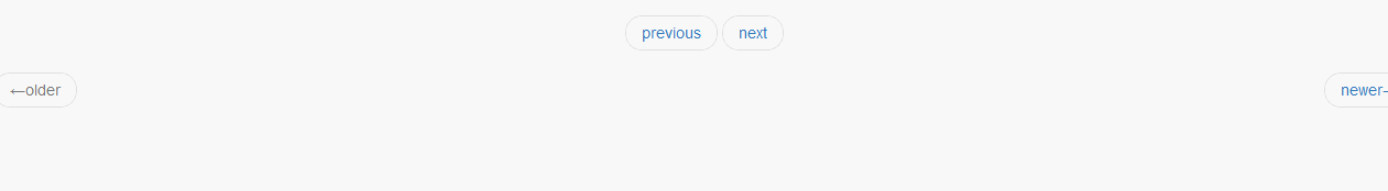 <!--翻页--> <nav> <ul class="pager"> <li class="active"><a href="#">previous</a></li> <li><a href="#">next</a></li> </ul> </nav> <!--对齐链接分居两端加了previous类和next类--> <nav> <ul class="pager"> <li class="previous disabled"><a href="#"><span aria-hidden="true">←</span>older</a></li> <li class="next"><a href="#">newer<span aria-hidden="true">→</span></a></li> </ul> </nav>