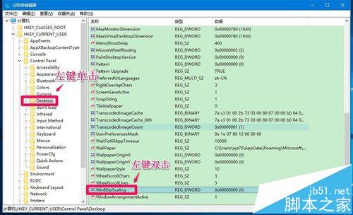 3、在Control Panel的展开项中找到Desktop(桌面),并左键单击:Desktop,在Desktop对应的右侧窗口中找到Win8DpiScaling(Win8 DPI缩放),并左键双击:Win8DpiScaling;