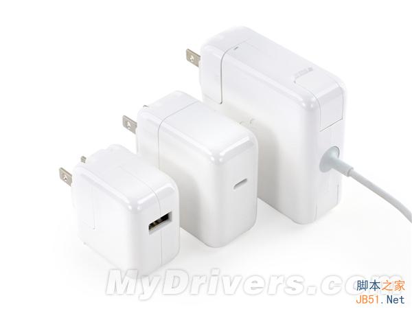 上图中三款电源适配器分别是10W iPad USB适配器(左侧)、29W USB-C电源适配器(中间)和60W MacBook Air MagSafe 2电源适配器(右侧)。这也是第一台没有 MagSafe的MacBook。