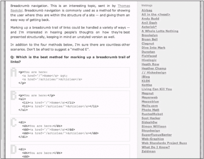 为了达到图6-1的显示效果,让我们假设链接栏放在id设为sidebar的<div>中,这样我们就能用CSS指定#sidebar之内的链接要以粗体显示: