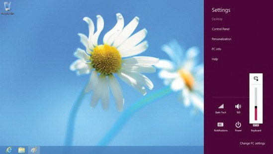 在Windows 8系统中查看剩余电量十分方面,你可以在任何进行下使用新增的Charms边栏来查看,只需要使用手指或鼠标从屏幕右侧向左滑动,就可以看到了。如果你在桌面界面中,电池电量图标则向往常一样,在任务栏右侧。