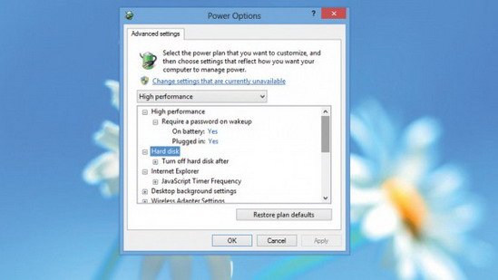 你还可以进入更高级的电源设置选项,如果你有信心掌握Windows 8的话。从“电源选项”窗口中,单击 “更改计划设置”,然后选择“更改高级电源设置”。在这里,你可以发现更多高级设置,比如何时关闭硬盘、USB接口和更多。