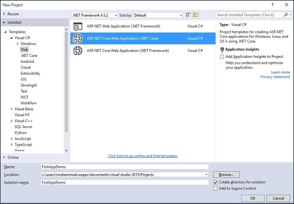在左侧面板中选择Templates → Visual C# → Web ,然后在中间面板中选择ASP.NET Core Web Application (.NET Core)模板。还让我们给应用取名为FirstAppDemo并指定Asp.Net Core项目的位置,然后单击OK。