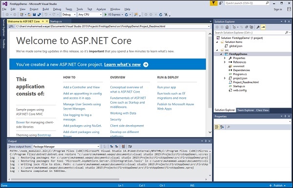 只要你安装了Visual Studio 2015的.net core工具,您就可以开始构建一个新的ASP.net core应用程序,从菜单选择:File → New Project