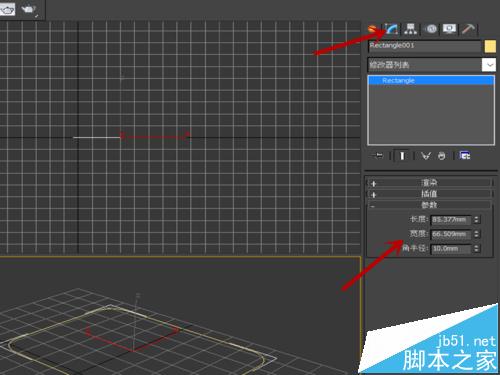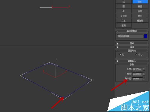 3、在3D Max中矩形除了长度与宽度这两个参数之外,还有一个角半径。这个角半径指的就是四个角的圆弧倒角半径。当你给它一定的值后,你便会发现四个角变成了弧形。
