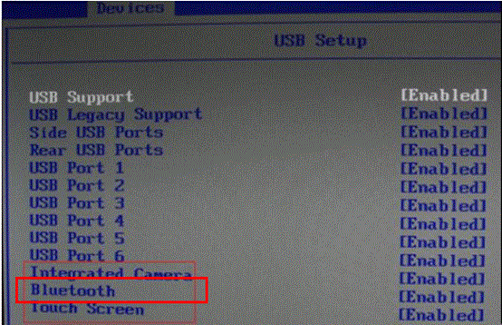 4. 如设备管理器中无法发现蓝牙,针对一体机,部分BIOS中可以屏蔽蓝牙,您可以将机器关机,按下电源开关后不停的敲击键盘上的“F1”,用方向键移动到“Devices”-“USB Setup”选项敲击键盘上“Enter”按键,找到“Bluetooth”选项,请确保此选项状态为“Enabled”。