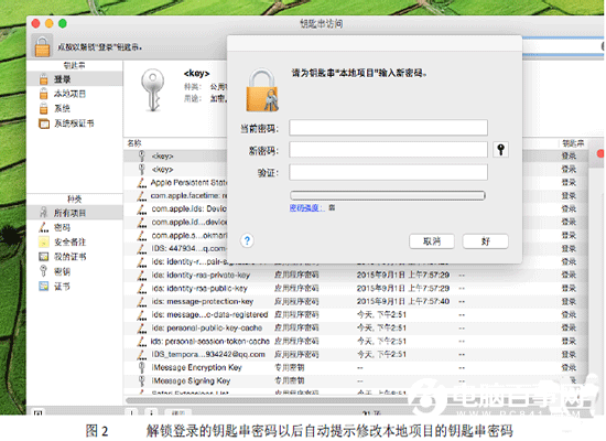 一、如果在修改密码以后登录时有提示钥匙串密码问题,最好选择创建新钥匙串,虽然以前记住的密码都忘记了,但是不会一直要求验证密码,只需要将所有的应用程序密码重新输入一次即可