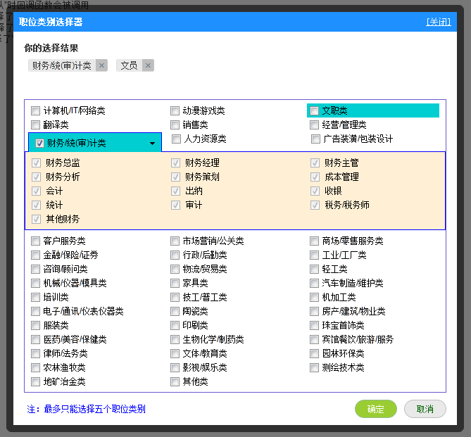 调用例子:选择编号为1的职位小类,编号为2的职位大类,定义选择器的名称为职位类别选择器
