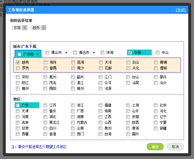 调用例子:选择编号为1和2的县或区,定义选择器的名称为工作地区选择器