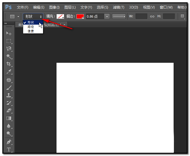 2、点选“矩形工具”后,在命令下方,如下图箭头所指的位置,点下三角,弹出的菜单中点选“形状”;