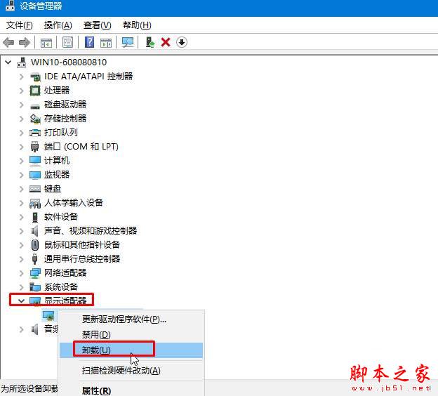 2、展开“显示适配器”,将下面的显卡上单击右键,点击“卸载”将驱动卸载;
