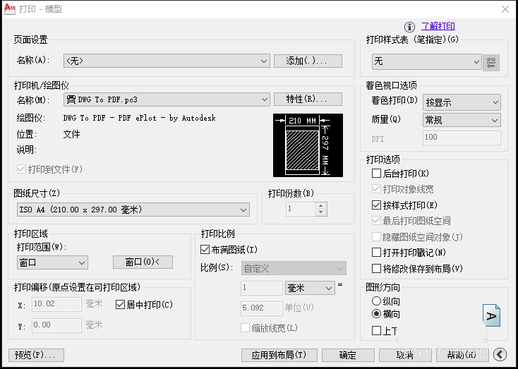 4、这时如果将图纸打印成PDF,那样就能较好地融入图中了。点击菜单“文件”→打印,打开如图所示窗口。打印机选择“DWG to PDF.pc3”,打印范围选“窗口”,直接选中图形对象。