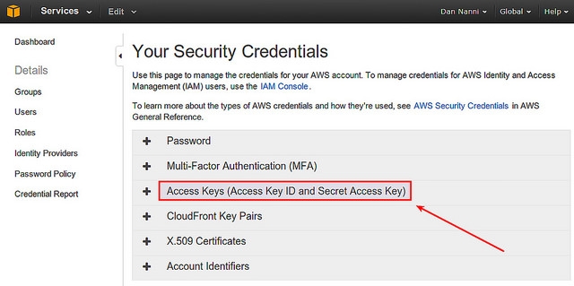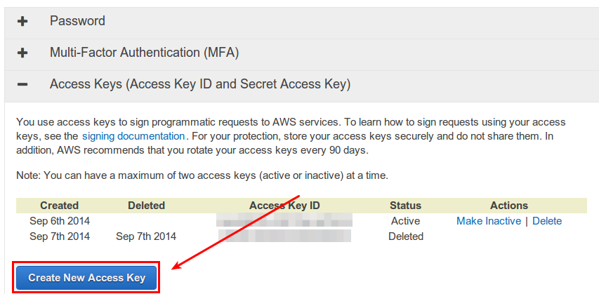 在下一页中,你将看到一个现存访问密钥ID列表(如果有的话)。注意,你不能恢复现存访问密钥ID的“秘密访问密钥”。出于安全的原因,秘密访问密钥只能在你创建新访问密钥时才可见。
