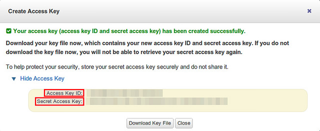 要么下载一个包含有新访问密钥的密钥文件,要么复制并粘贴新访问密钥信息。再次提请牢记,一旦你关闭该窗口,秘密访问密钥将不再可用,除非你下载一个密钥文件。