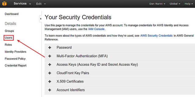 要管理IAM用户,点击“安全凭证”页面上的“用户”菜单(见图示)。