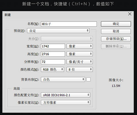 1、新建一个文档,快捷键(Ctrl + N),数值如下。