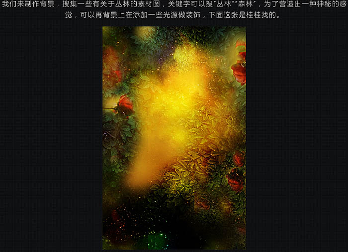 2、我们来制作背景,搜集一些有关于丛林的素材图,为了营造出一种神秘的感觉,可以在背景上添加一些光源做装饰。