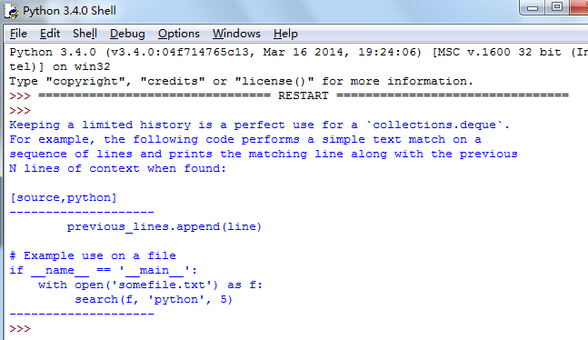 >>> from collections import deque >>> q=deque(maxlen=3) >>> q.append(1) >>> q.append(2) >>> q.append(3) >>> q deque([1, 2, 3], maxlen=3) >>> q.append(4) >>> q deque([2, 3, 4], maxlen=3) >>> q.append(5) >>> q deque([3, 4, 5], maxlen=3) >>>