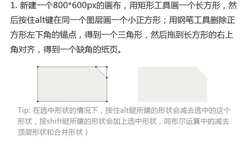1、新建画布,用矩形工具画一个长方形,然后按住alt键在同一个图层画一个小正方形,用钢笔工具删除正方形左下角的描点,得到一个三角形,然后拖到长方形的右上角对齐,得到一个缺角的纸张。