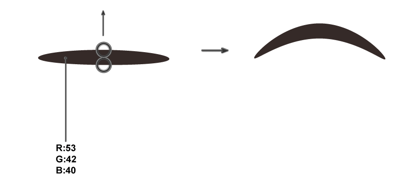 第5步、让我们制作眉毛吧。使用椭圆工具(L),创建一个薄而水平的深色椭圆。然后采用直接选择工具(A),通过拖动椭圆形的顶部和底部锚点并将其向上滑动来选择。这将是眉毛。