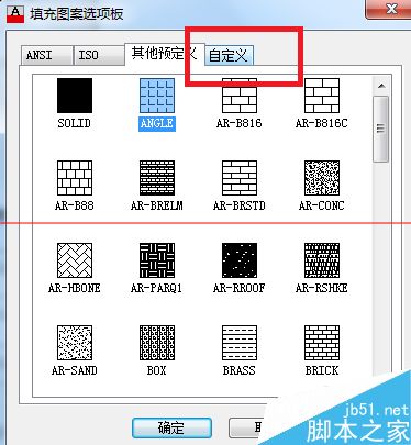 第七:在填充工具栏中,点击下图小箭头,进入图案填充和渐变色对话框,选择图案后的三点,进入填充图案选项板,选择“自定义”,即可看到制作绘制图案的名称和预览图。