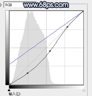 2、按Ctrl + Alt + 2 调出高光选区,按Ctrl + Shift + I 反选得到暗部选区,然后创建曲线调整图层,对RGB,蓝通道进行调整,参数及效果如下图。这一步把暗部稍微调暗,并增加蓝色。