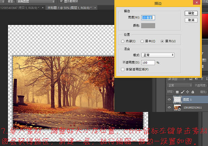 2、导入素材,调整好大小及位置,Ctrl + 鼠标左键单击素材图层获得选区,新建一层,执行:编辑 > 描边,设置如下图。