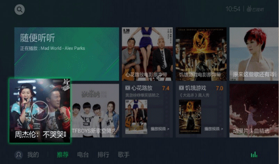 QQ音乐TV版:QQ音乐是由腾讯出品的,现在也在电视端大方光彩,以庞大的音乐库来得到用户们的认可,该软件在歌曲内容上也算是数一数二的了,你几乎都能在上面找到你想听的音乐。