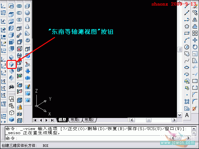 2、在东南视图的界面里,点击“长方体”按钮,在界面里指定长方体的一个角点后,再输入“L”,说明要画的是长方体,而非立方体。