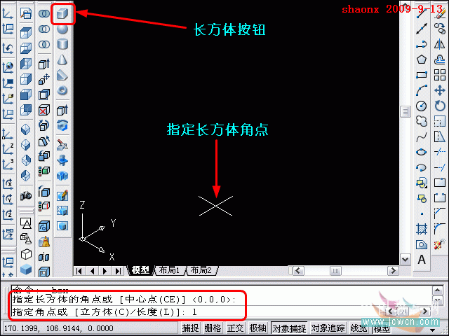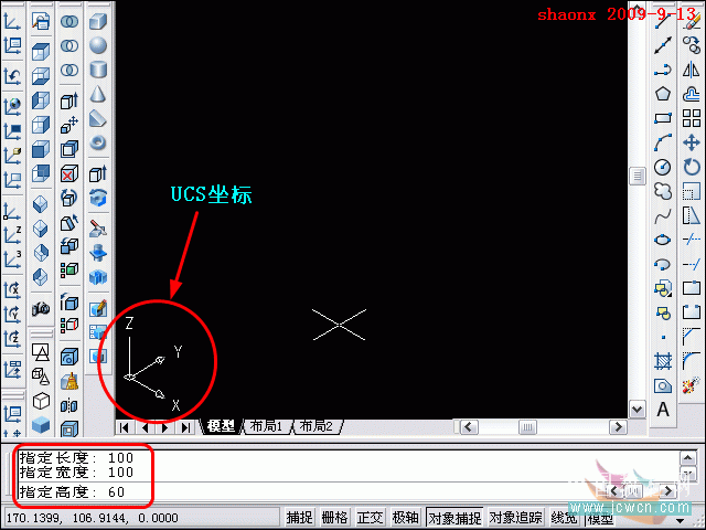 3、接着,在命令行里输入“长宽高”的数值,这在前面已讲过,“长宽高”对应的是UCS坐标的“XYZ”轴。