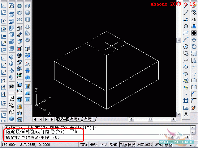 还有一个就是现在用的“面拉伸”命令(在实体编辑工具条里),这个命令是对三维实体的一个面进行拉伸。