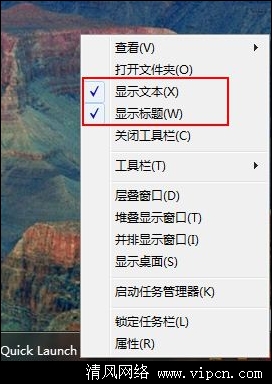 3、这时任务栏上就会显示一个“Quick Launch”的工具栏,在此工具栏上点击右键,先将任务栏解锁,然后再在此工具栏上点击右键,撤销“显示文本”和“显示标题”。