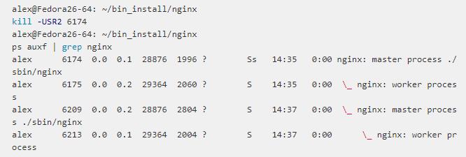 第一种方式的原理是,产生一个新进程,该进程通过 nginx.pid 文件得到 master 进程的 pid,然后把对应的信号发送到 master,之后退出,这种进程被称为 signaller。
