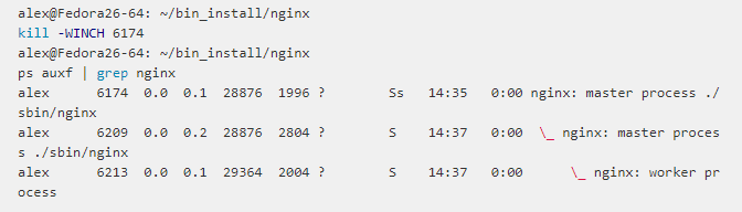 可以看到新的 master 和该 master fork 出来的 worker 已经在运行了,此时我们接着向旧 master 发送一个 SIGWINCH 信号,旧 master 收到这个信号后,会向它的 worker 发送 SIGQUIT,于是旧 master 的 worker 进程就会退出: