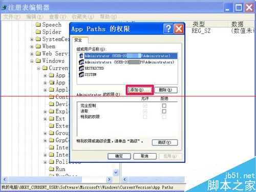 4,进入“App Paths权限”窗口后,如果在“组或用户名称”中没有当前用户时,那就要“添加”一个。