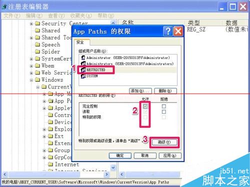 5,如果用户名称已经存在,则选择自已用户名,这里以“RESTRICTED”为例,然后在下面的权限列表框中,勾选“允许”下的“完全控制”复选框,然后按“应用”与“确定”退出注册表。