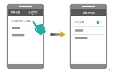 5、Android用户请确保华为穿戴APP在后台运行,建议您将APP加入到受保护的后台应用程序中。以Mate s为例,选择 设置 > 全部设置 > 受保护的后台应用进行添加。