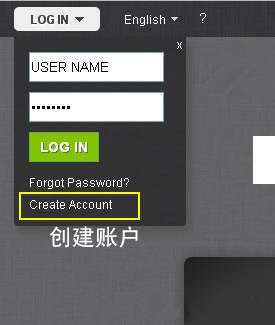 在LOG IN后面下拉箭头处有下拉,如果我们有账户的话直接登陆,如果没有就点击”Create Account”文字链接注册新账户。