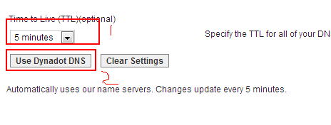 在生效时间选择最短的5分钟,然后点击"USE DYNADOT DNS",这样我们的DNS就会使用DYNADOT自带的,如果你想用主机DNS,简单的很,直接在第二步中的菜单导航中的NAMESERVER输入新的DNS即可。