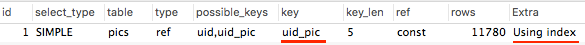 explain select SQL_NO_CACHE picname, smallimg from pics where user_id=17853
