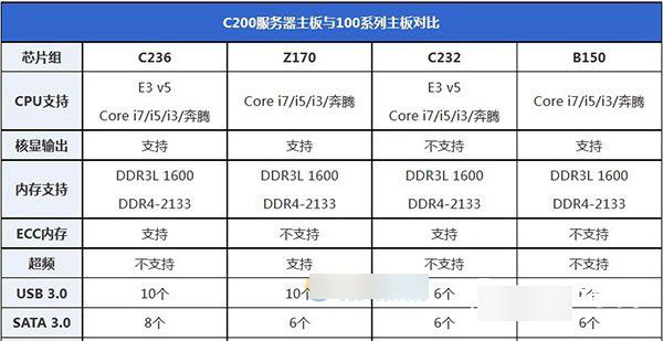 目前C200系列全新主板型号主要有C236、C232,其中C236就相当于是Z170主板,支持服务器专属的ECC内存,但不支持超频,所以在一定程度上我们可以把C236主板看作是不能超频的Z170。而C232就相当于是B150主板,只是这款芯片主板不支持核心显卡。