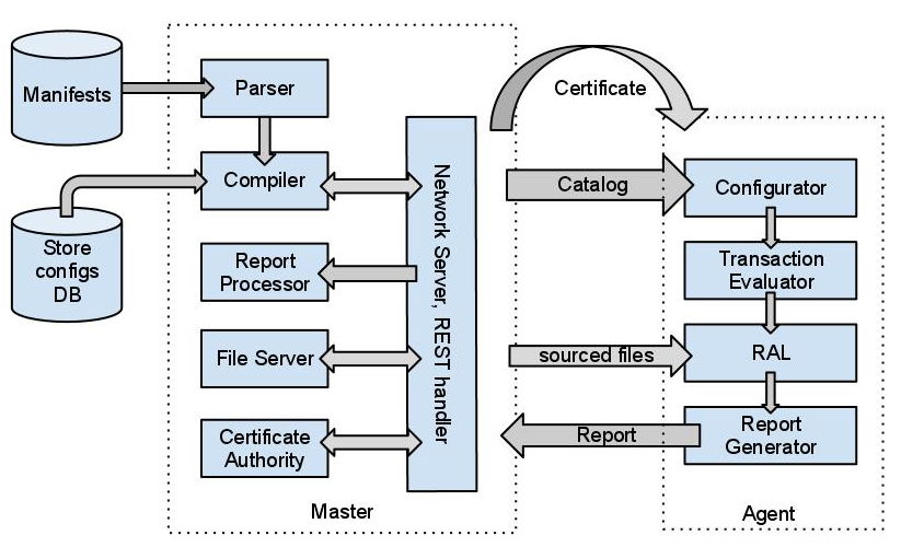 puppet采用C/S星状的结构,所有的客户端和一个或几个服务器交互。每个客户端周期的(默认半个小时)向服务器发送请求,获得其最新的配置信息,保证和该配置信息同步。每个puppet客户端每半小时(可以设置)连接一次服务器端, 下载最新的配置文件,并且严格按照配置文件来配置客户端. 配置完成以后,puppet客户端可以反馈给服务器端一个消息. 如果出错,也会给服务器端反馈一个消息.