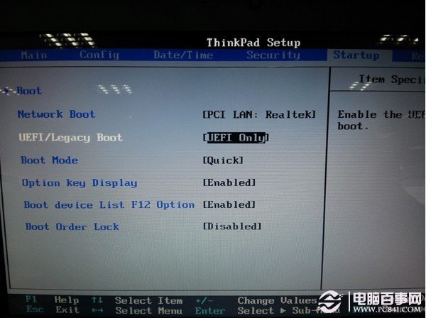 1.开机F2进入BIOS,然后在startup下UEFI/Legacy Boot选择UEFI Only,这项设置我们根据自己电脑的具体设置查找,现在的新电脑一般都是支持UEFI的,然后保存重启;