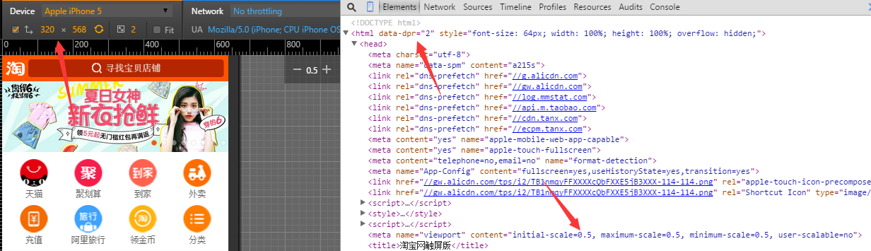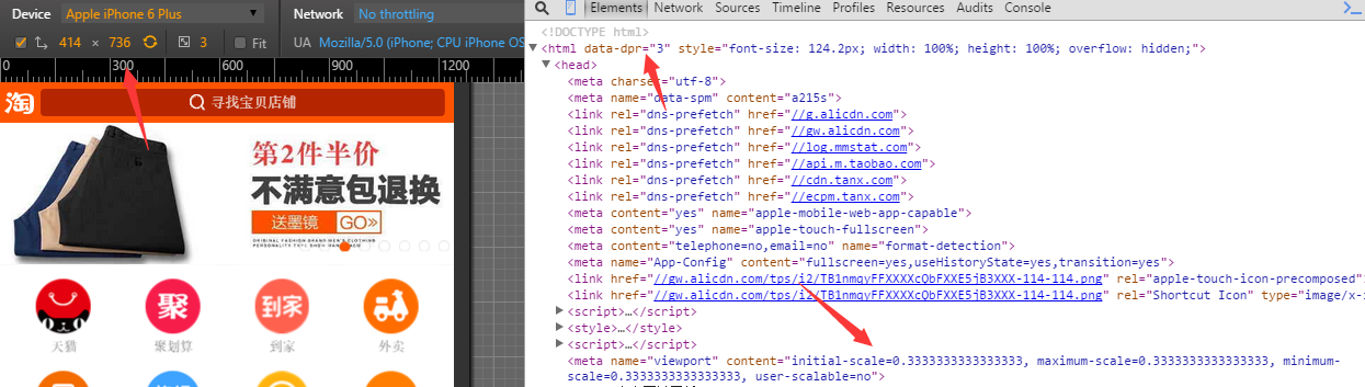 淘宝触屏版布局的前提就是viewport的scale根据devicePixelRatio(设备像素比) 动态设置:
