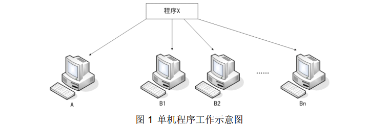单机,即不连接到其他计算机的计算机,不在网络中。例如:两单机A、B,只在A上安装有程序X,若要在B上得到X的运行结果,则必须在B上安装一遍X,然后运行。若B类的计算机比较多,则需要逐一安装运行。它们之间不能直接进行通信和协作。如图1所示。