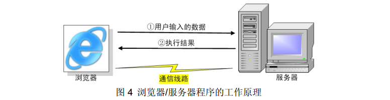 若通过客户机中的浏览器(Browser),向服务器发出请求,接收其响应的结果,那么,这时,我们称这样的协作方式为B/S方式,或B/S架构,其工作原理如图4所示: