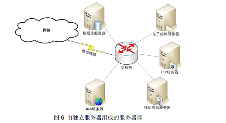 服务器,是担负服务任务的机器。这些服务任务由一般专门的软件来完成。一般地,把具有某种服务功能的服务器软件及其所在的机器,都统称为XX服务器(XX表示某种具体服务)。这些软件可以集中于一台机器中(如图5),这样的机器可以称为集中式服务器;也可以单独存在于某台机器中(如图6),这样的机器可以称为独立式服务器,多个独立式服务器可组成服务器群或矩阵。